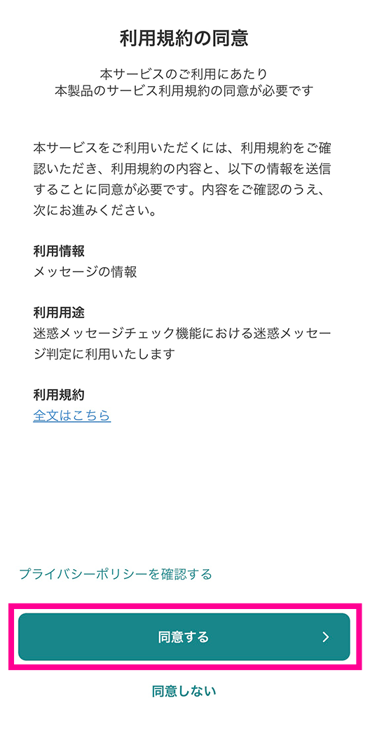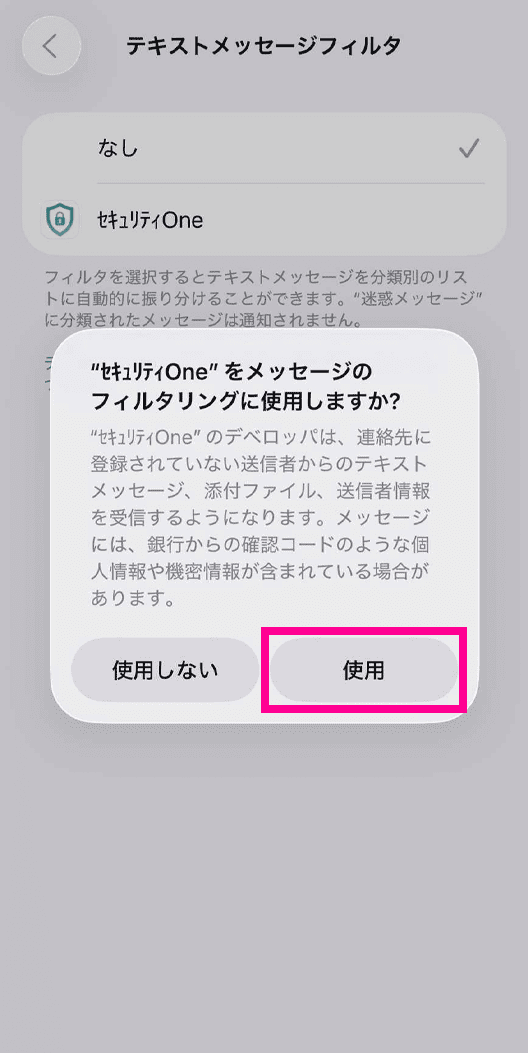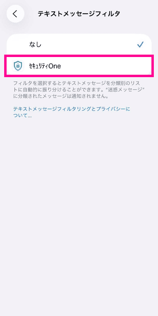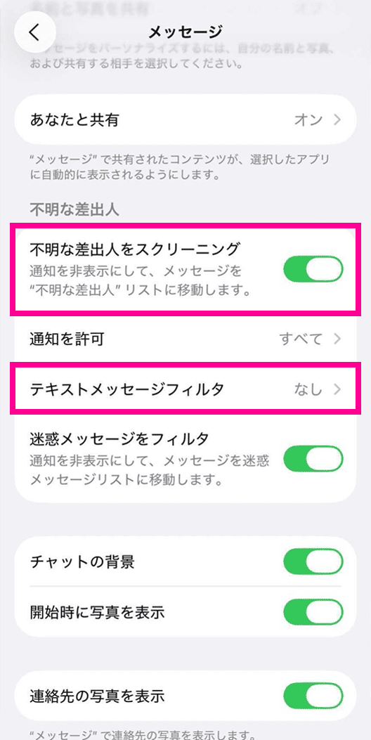 STEP 03 「不明な差出人をスクリーニング」のスイッチをONにし、「テキストメッセージフィルタ」をタップ
