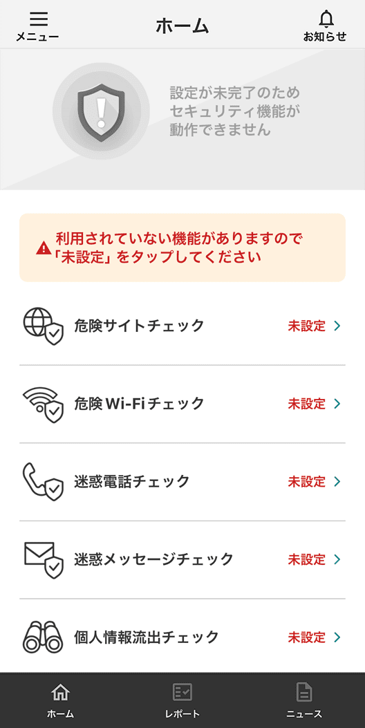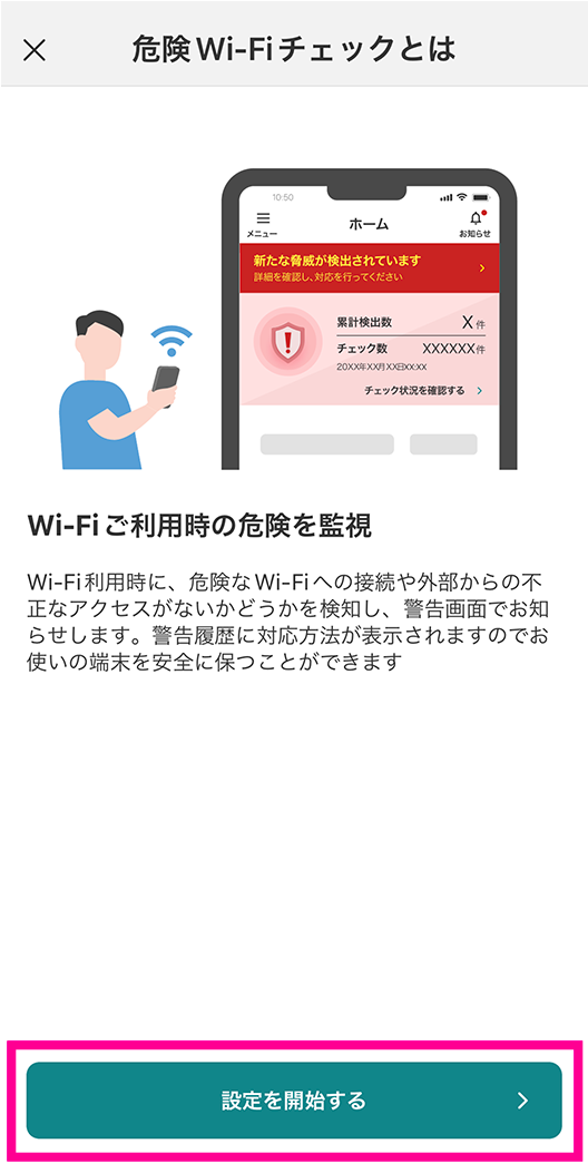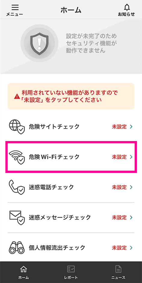 STEP 01 アプリTOPの「危険Wi-Fiチェック」をタップ