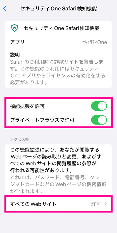 STEP 05 「セキュリティOne Safari検知機能」の「機能拡張を許可」と「プライベートブラウズで許可」のスイッチをONにし、「すべてのWebサイト」をタップ