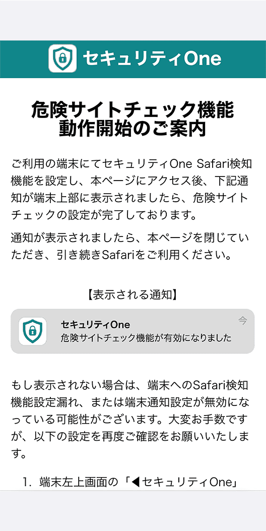 STEP 08 以下画面がSafariにて表示され、「危険サイトチェック機能が有効になりました」という通知が表示されたら設定完了